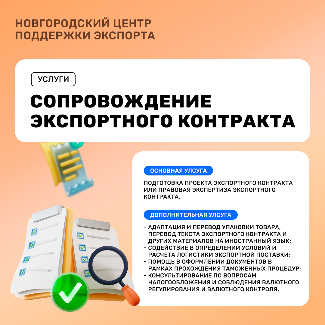 Новгородский центр поддержки экспорта предлагает комплексную услугу по подготовке и правовой экспертизе экспортных контрактов, чтобы ваша внешнеэкономическая деятельность была не только прибыльной, но и абсолютно безопасной.
