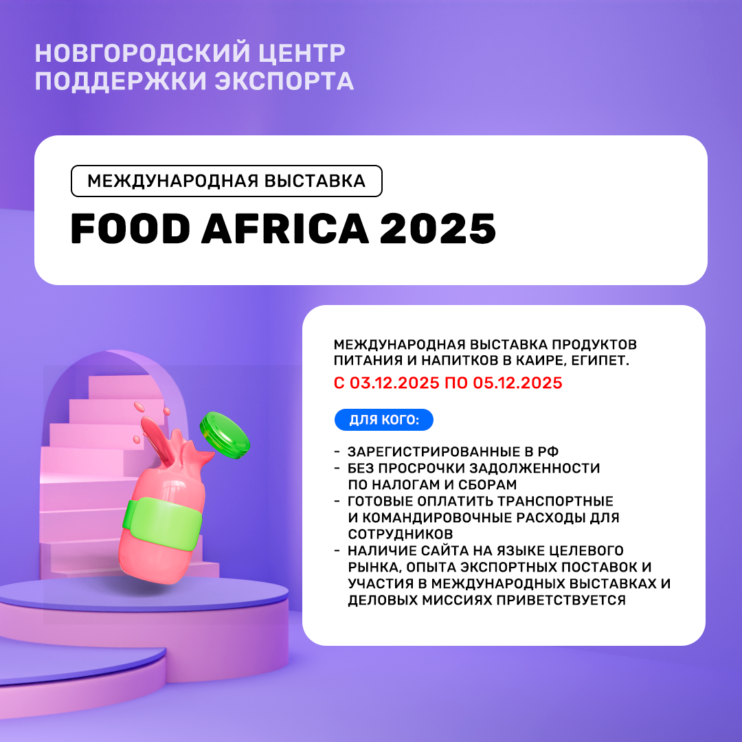 - Выход на перспективные рынки Африки – представьте свою продукцию ключевым игрокам быстрорастущего региона с высоким спросом на качественные продукты питания.